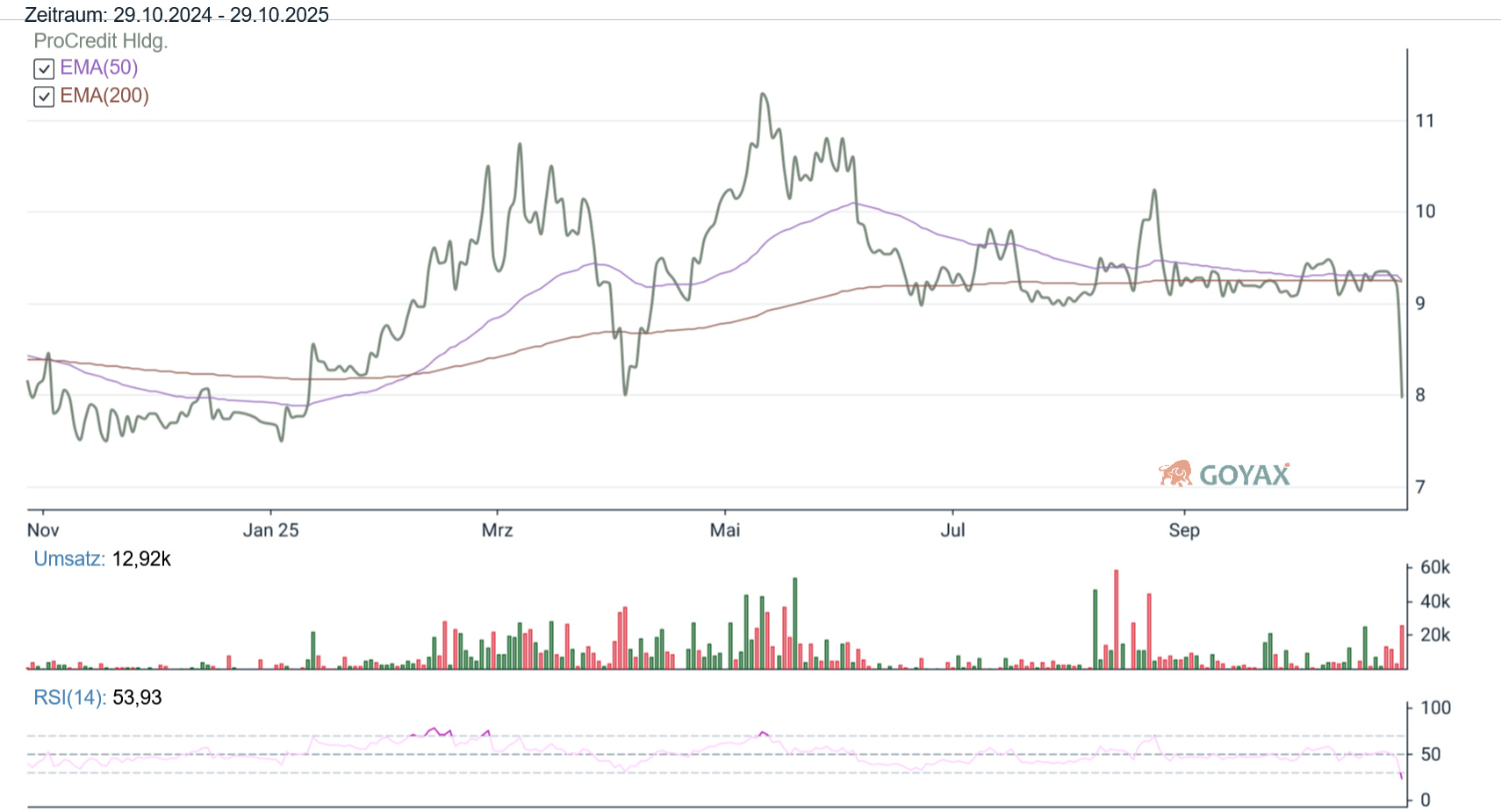 ProCredit musste bereits um 13:24 Uhr den Kurseinbruch ihrer Aktie einläuten. Im Rahmen einer Prognosereduktion wurde aus einer erwarteten Eigenkapitalrendite von rund 10% ein neuer Wert von 7 bis 8% angekündigt. Gründe sind vornehmlich in eienr erhöhten Risikovorsorge zu sehen. Und da die Hoffnung auf einen Frieden in der Ukraine immer noch mehr als vage sind, kann auch die Hoffnung auf Wiederaufbaugeschäft in dem gebeutelten Land, das früher einer der wichtigsten Märkte für ProCredit war, nicht kursstützend wirken. Bis zum Abend sank de rKurs des SDAX-Wertes bis auf 7,98 EUR (Lange und Schwarz, 19:16 Uhr, 28.10.2025). Und das bedeutet ein Kursminus von 13,26%! Ob es am Mittwoch noch weiter runtergeht? Man wird sehen…