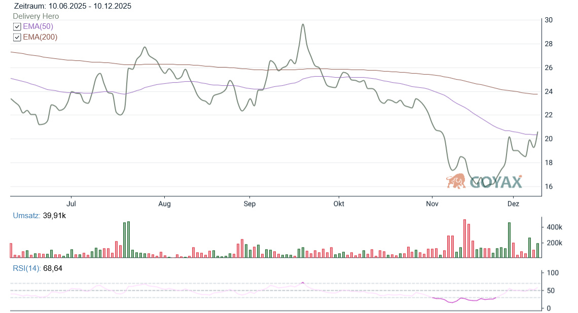 Chart: Delivery Hero, letzte 6 Monate mit Trendwende am 28.11.?| Powered by GOYAX.de