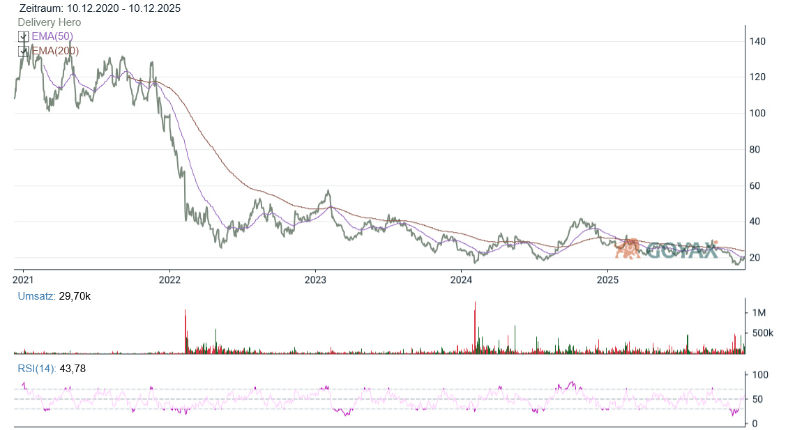Die zentrale Kritik der Investoren: die desaströse Aktienkursentwicklung. Die Delivery-Hero-Aktie hat im vergangenen Jahr mehr als 50% an Wert verloren und notiert fast 90% unter ihrem Allzeithoch von 2021. Trotz wiederholter operativer Erfolgsmeldungen blieb die börsliche Anerkennung aus – eine Kluft, die das Management nun mit Nachrichtendruck von außen schließen muss.