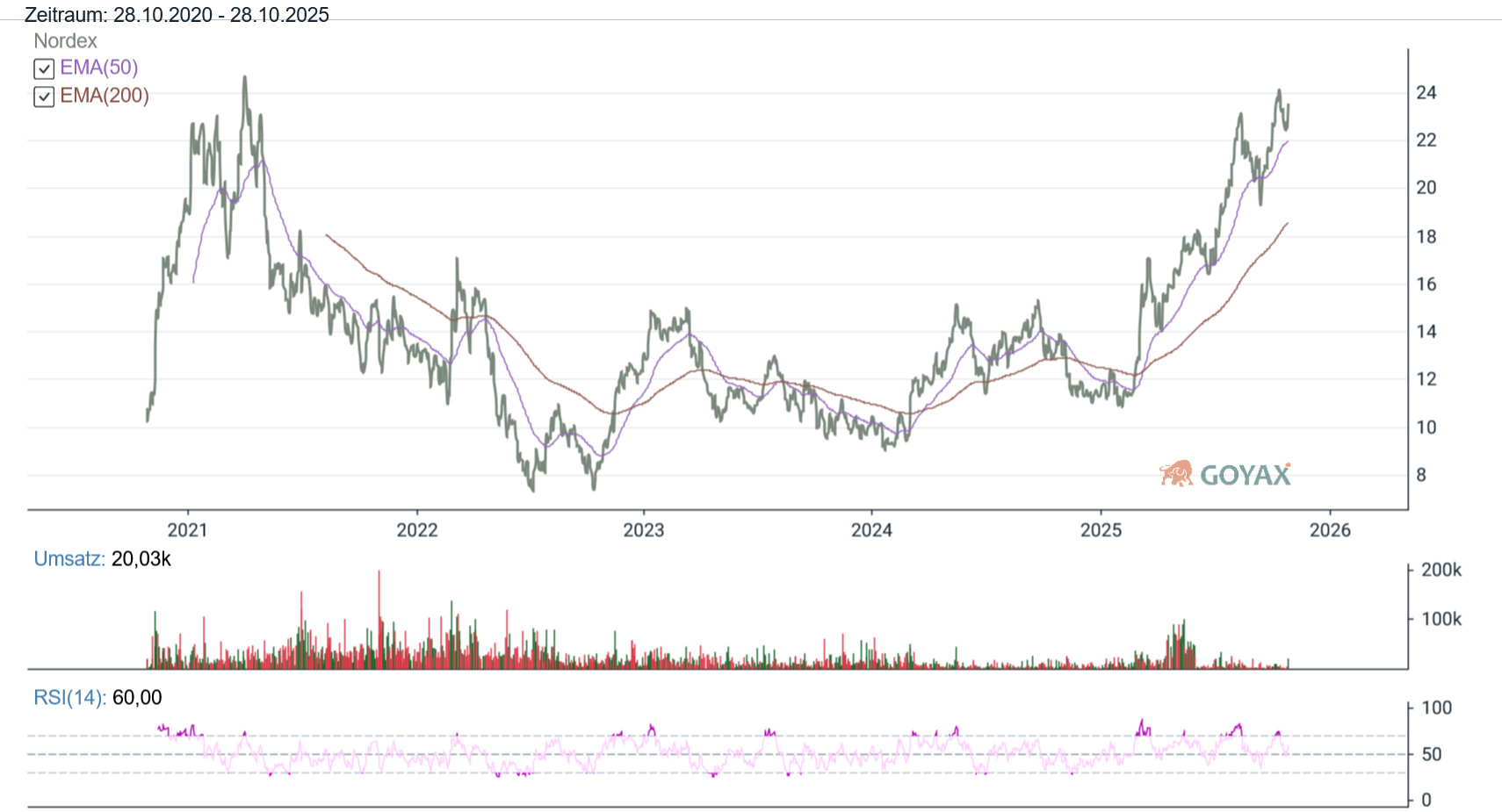 „Nordex Group hebt ihre Prognose für die EBITDA-Marge im Gesamtjahr 2025 an – basierend auf starken vorläufigen Zahlen für das dritte Quartal.“ (ad-hoc, 27.10., 19:23 Uhr)