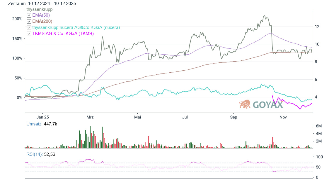 Schaut man sich die Performance und die Chancen der Mutter ThyssenKrupp an. Und vergleicht diese mit den Töchtern TKMS und ThyssenKrupp nucera, könnte man versucht sein, sich auf die Töchter zu fokussieren. Die eine ist eine klare Wette auf den letztendlichen Erfolg der Wasserstoffwirtschaft, die andere ein Defnesewert, der aufgrund überquellender Orderbücher jahrelanges Wachstum „garantiert“ hat.