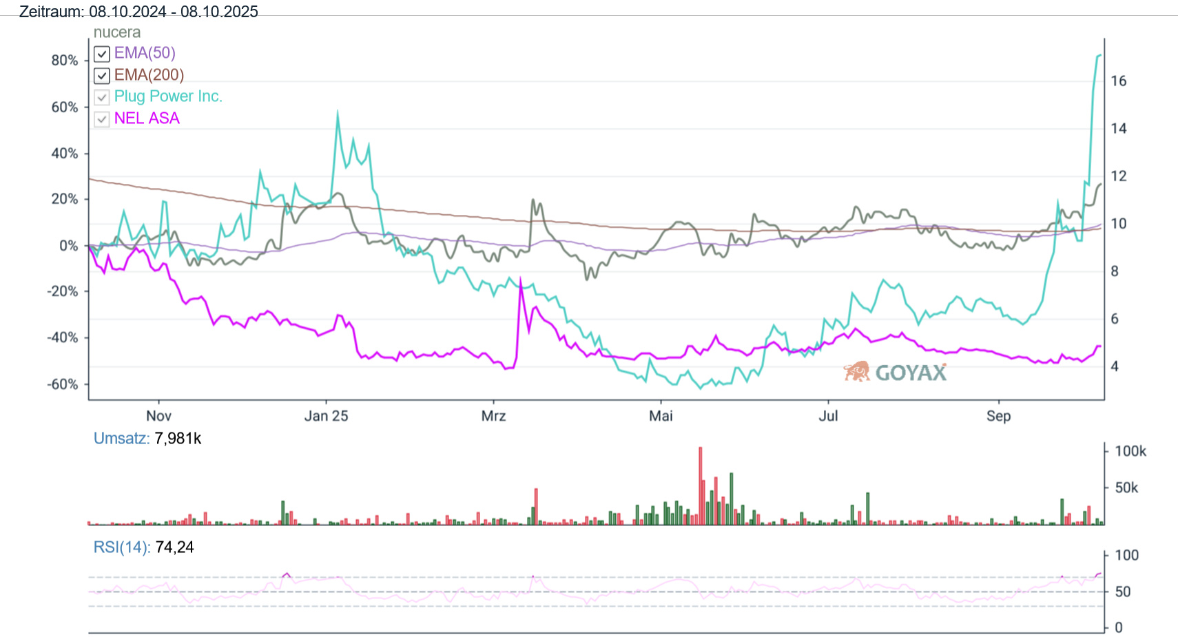 Chart. thyssenKrupp nucera. Nel. Plug Power. Im Vergleich der letzten 12 Monate. Powered by Goyax.de.